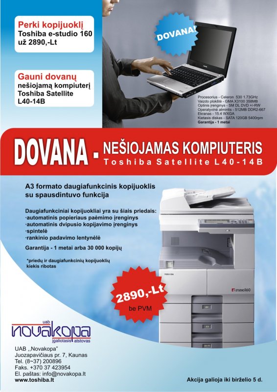 Pirkdamas kopijuoklį Toshiba e-studio 160 už 2890+PVM, gauni dovanų nešiojamą kompiuterį Toshiba Satellite L40- 14B